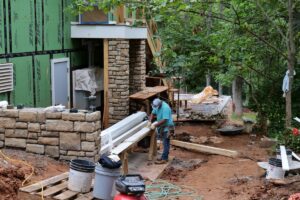 • Work on exterior grading and drains is ongoing and (alas!) continues to be hampered by the weather and soil conditions.